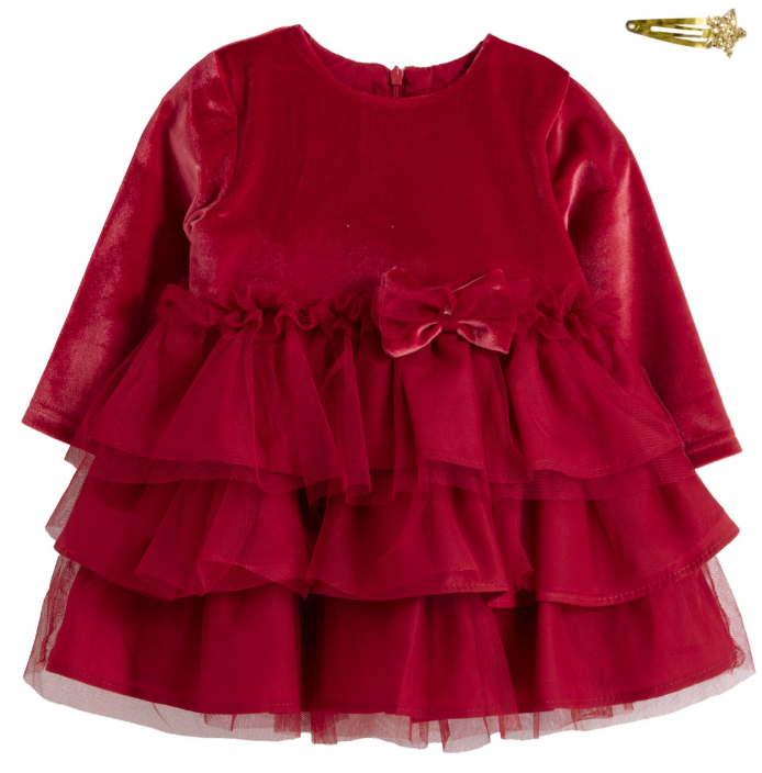 Φόρεμα BABYLON Βελούρ με τούλινα βολάν και τσιμπιδάκι, Κόκκινο